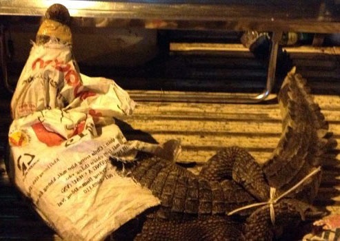 Con cá sấu nặng 50kg dài gần 2m, bị cột 4 chân được đưa đi chữa bệnh bị rớt giữa đường khiến nhiều người hoảng sợ. |