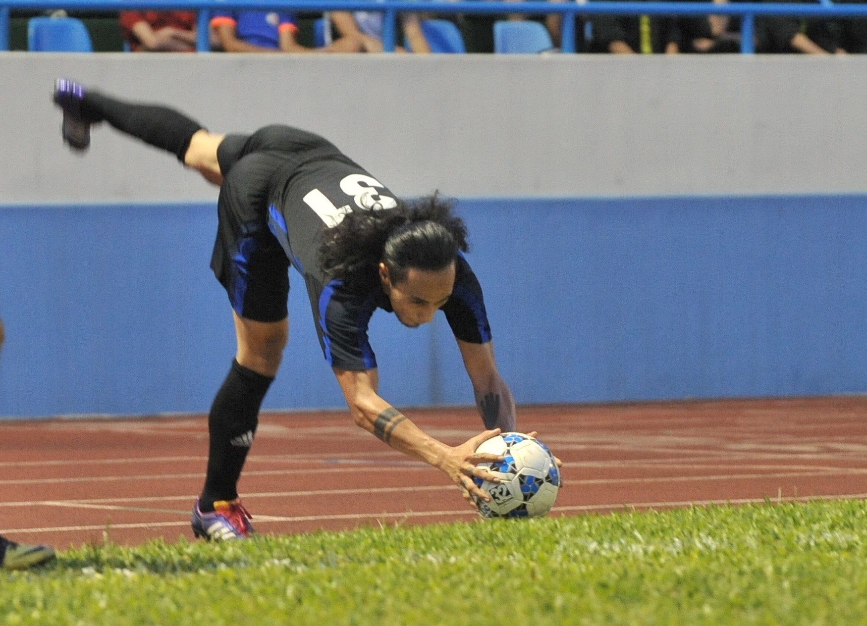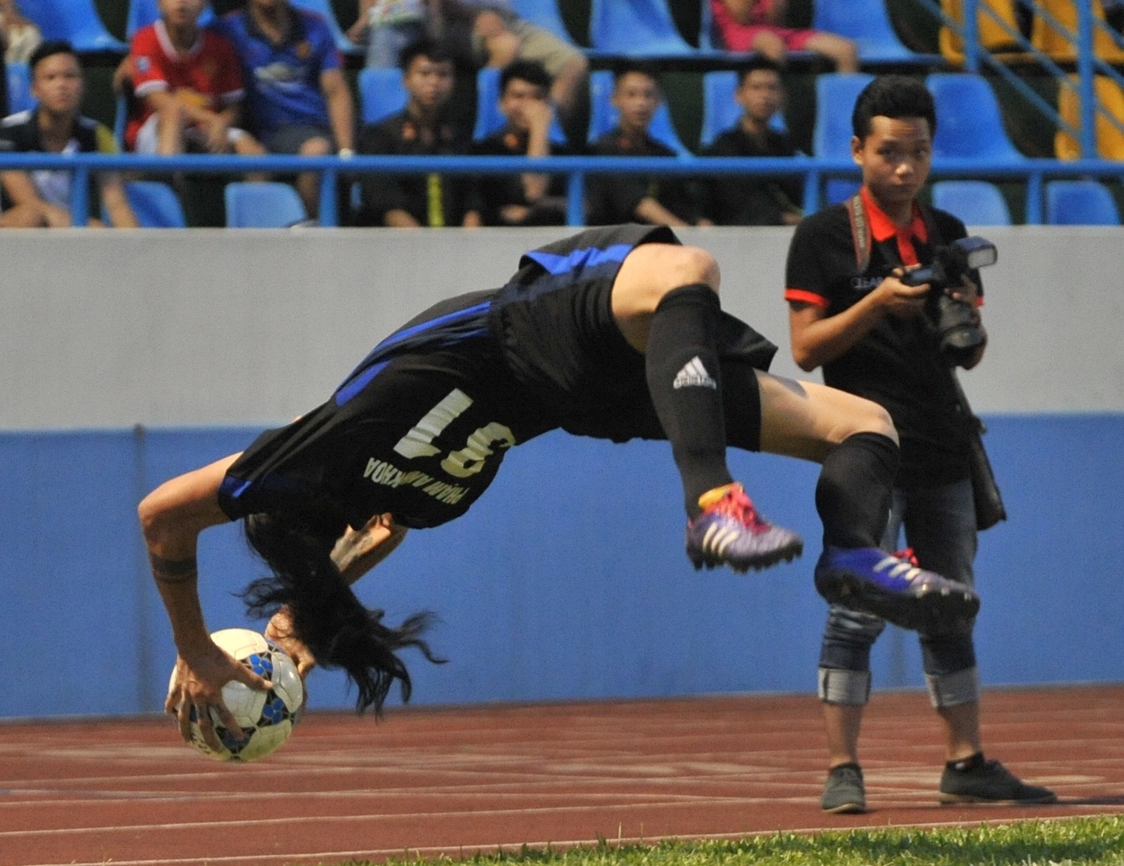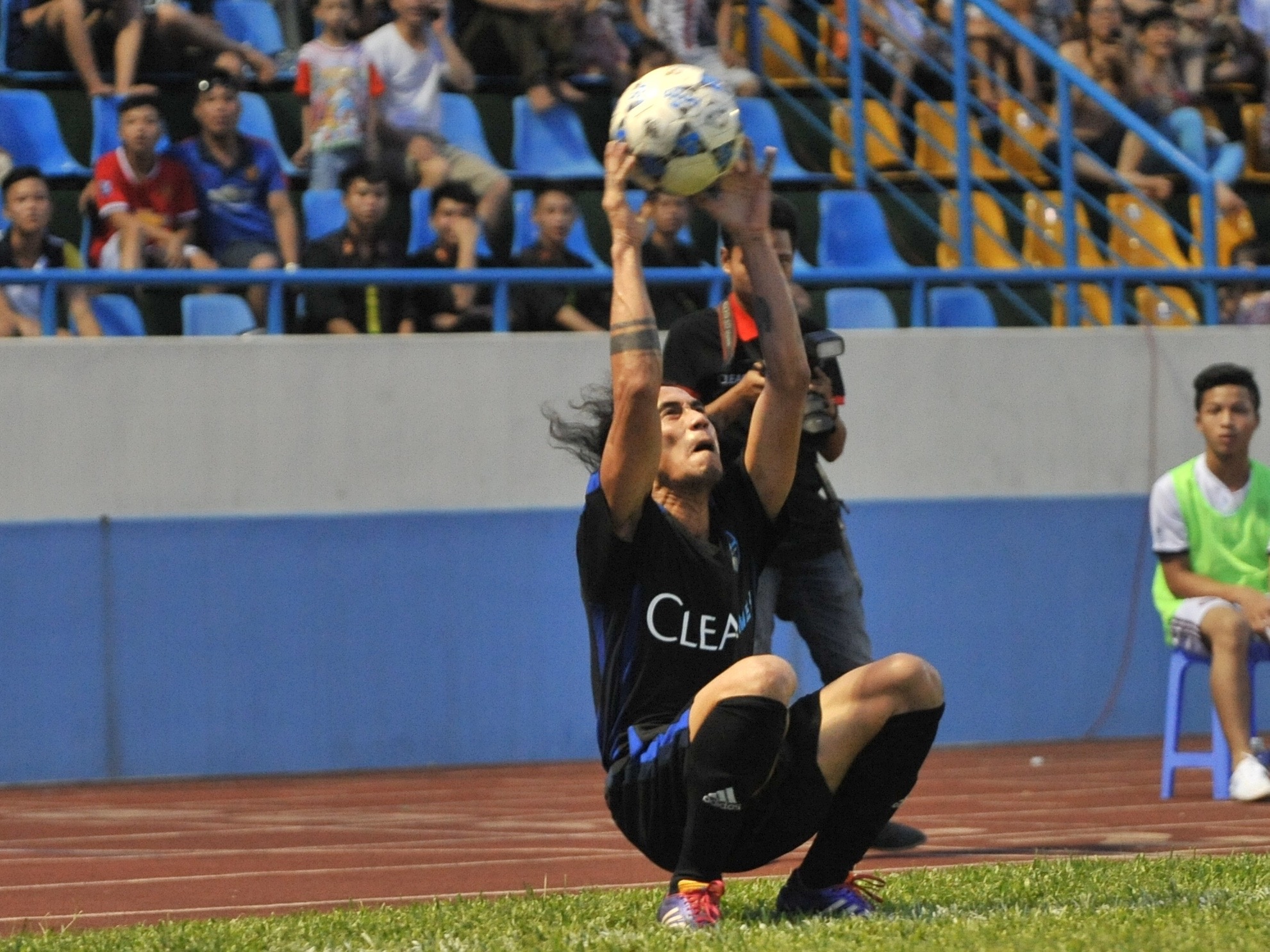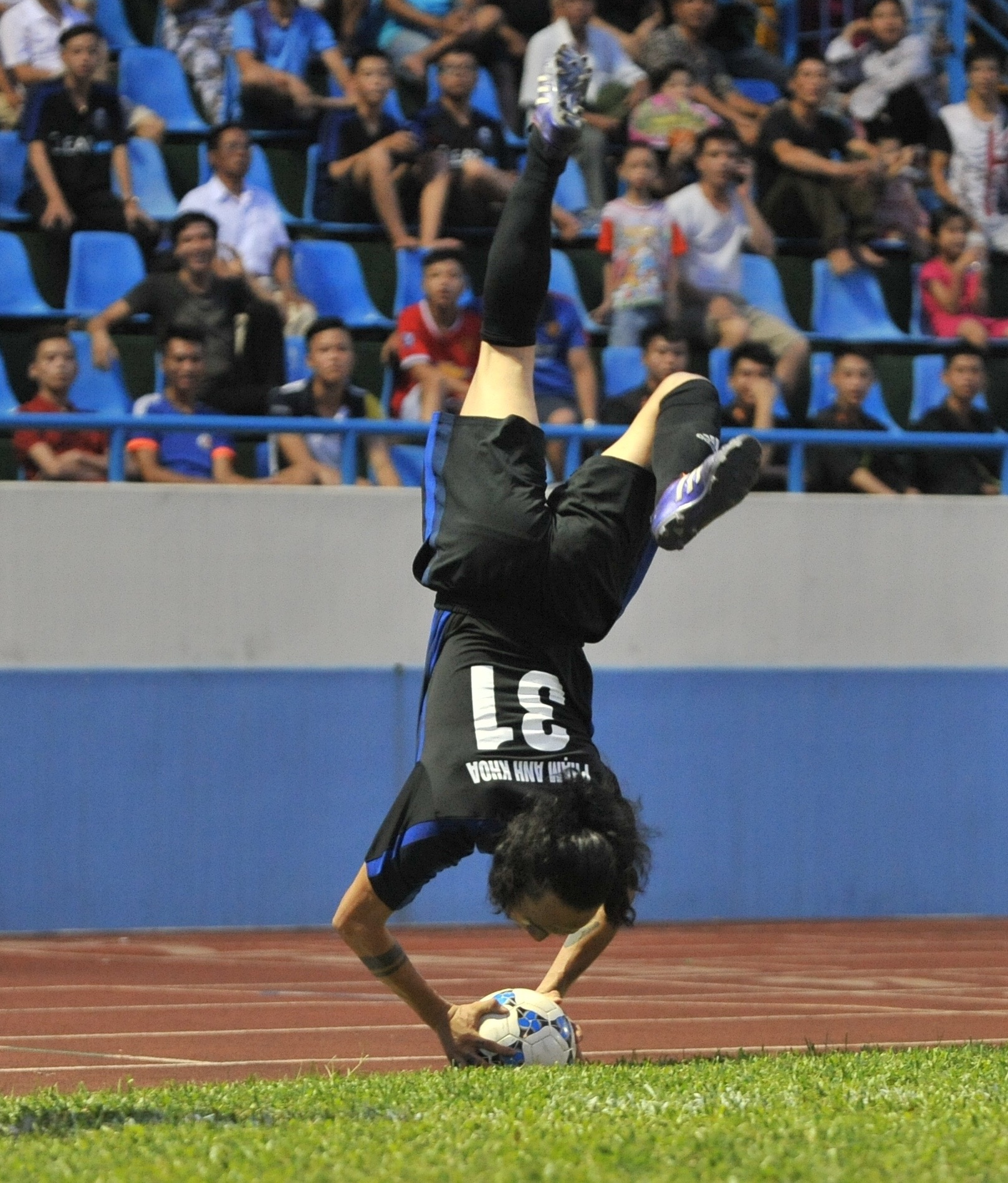 | Anh Khoa cho biết mình đã tập luyện kỹ năng này trong thời gian dài và thực hiện vài lần ở các sân phủi anh tham gia. Andy Cole ngồi trên băng ghế dự bị vỗ tay thích thú sau màn trình diễn của cầu thủ đội nhà. |
