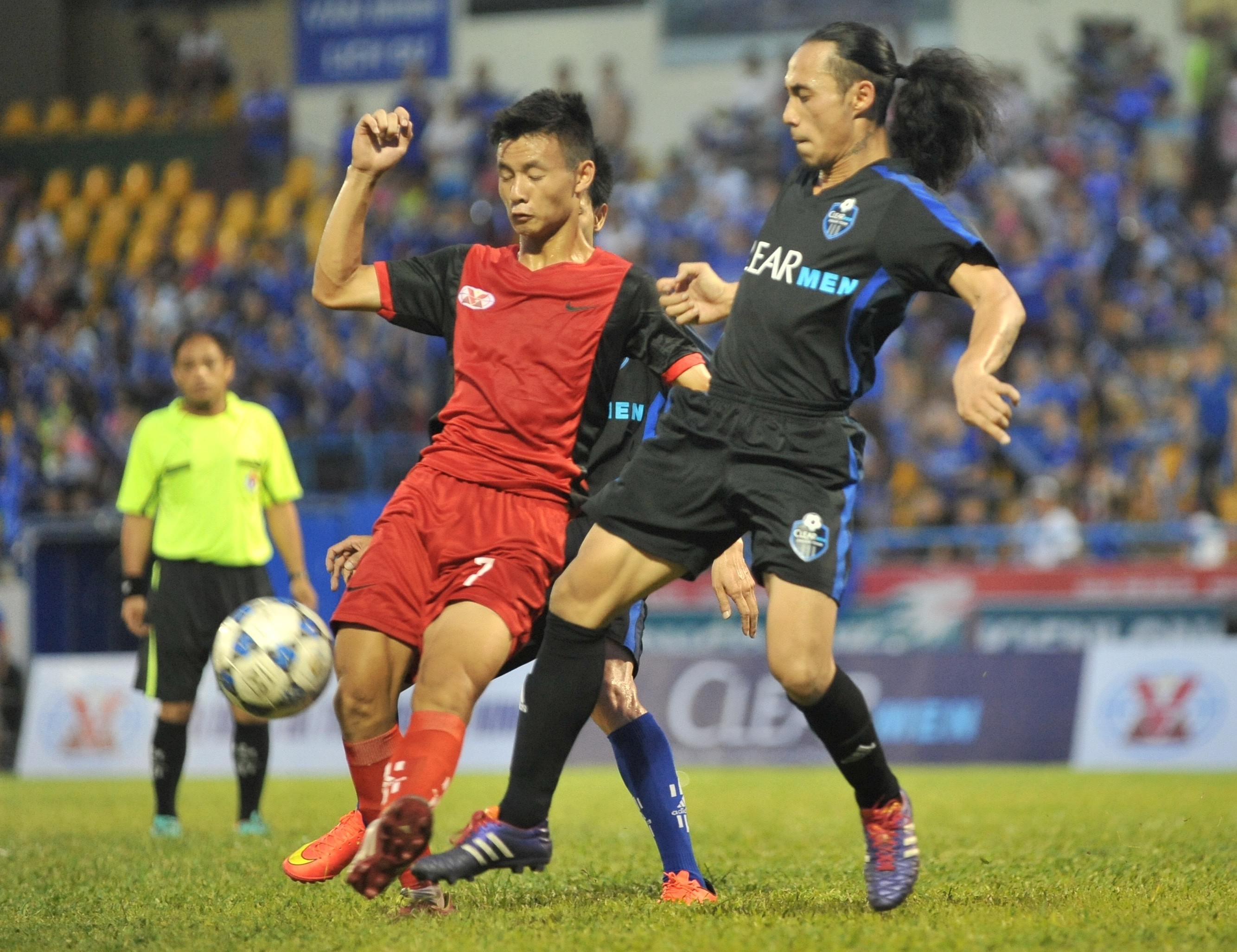 | Nam ca sĩ Anh Khoa thi đấu nỗ lực nhưng không thể giúp đội nhà chiếm lợi thế trước các cầu thủ chuyên nghiệp của đội trẻ Than Quảng Ninh. |