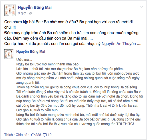 Rạng sáng 4/7, ca sĩ, BTV Bông Mai - con gái duy nhất của nghệ sĩ An Thuyên - nén đau thương, mất mát để bày tỏ tình yêu dành cho cha. Zing.vn xin trích dẫn toàn bộ chia sẻ của nghệ sĩ về người cha đáng kính: