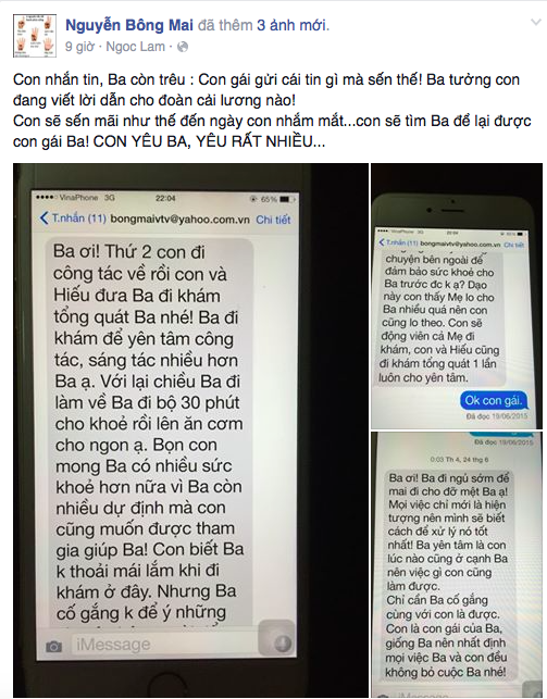 Trước đó, ca sĩ Bông Mai cũng chia sẻ những tin nhắn với bố và nghẹn ngào viết: "Con nhắn tin, ba còn trêu: con gái gửi cái tin gì mà sến thế! Ba tưởng con đang viết lời dẫn cho đoàn cải lương nào! Con sẽ sến mãi như thế đến ngày con nhắm mắt. Con sẽ tìm ba để lại được con gái ba! Con yêu ba, yêu rất nhiều".
