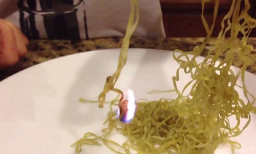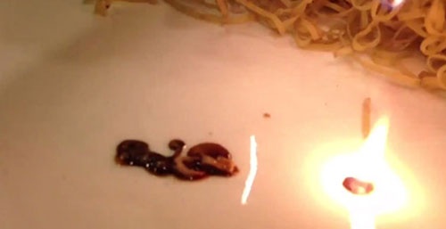 Thậm chí, Hồng Ngọc còn lấy lửa đốt và mỳ bốc cháy như cao su. Cô cho biết, ngọn lửa bốc mùi hôi, khét rất khó chịu. Nữ ca sĩ còn khẳng định, đây là loại mỳ 100% làm từ cao su và cảnh báo người tiêu dùng nên thật cẩn trọng khi lựa chọn sản phẩm cho gia đình.