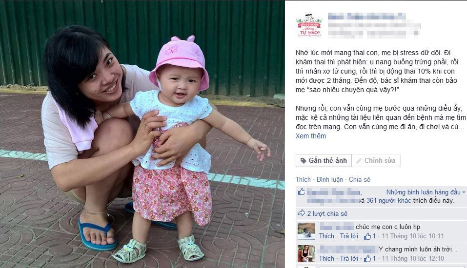 Tiêu biểu trong số đó, chị Vân Anh ở TP HCM đã chia sẻ một câu chuyện xúc động về quá trình chị sinh nở con gái. Sau những tháng ngày mang thai vất vả và stress vì bị u nang buồng trứng phải, nhân xơ tử cung, động thai 10% khi con mới được 2 tháng…, cuối cùng con gái chị cũng ra đời khỏe mạnh để đến bên chị. Vân Anh chia sẻ, niềm tự hào dành cho con không có gì hơn ngoài việc con đã đủ mạnh mẽ, đủ kiên cường để vượt qua bao khó khăn đến với mẹ trong cuộc đời này.
