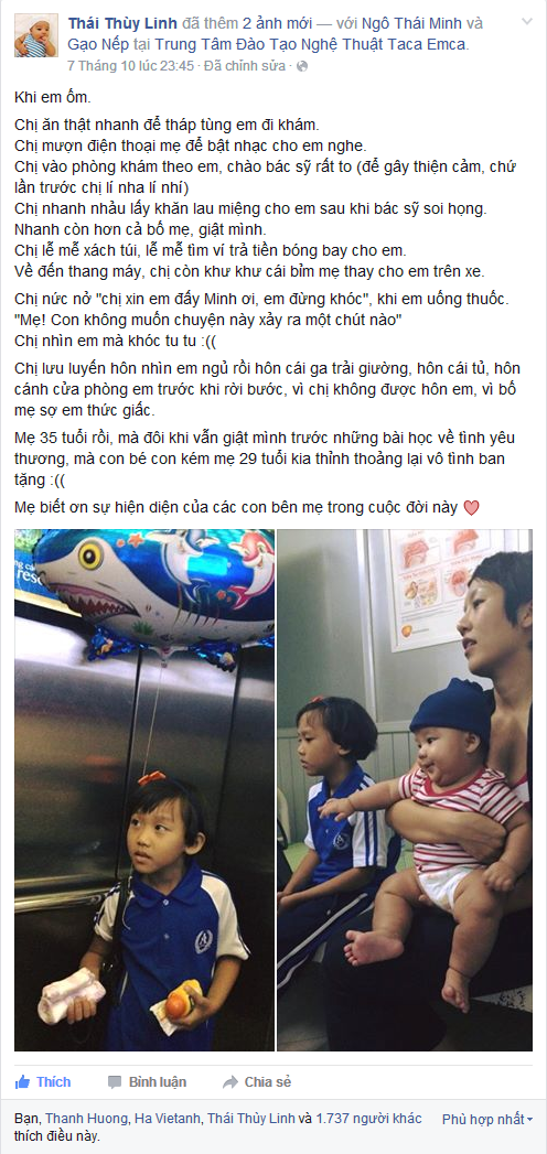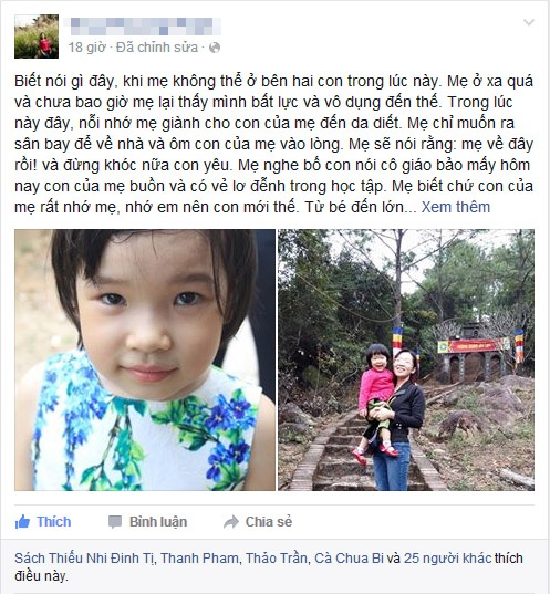 Hay tâm sự của một người mẹ khác, chị Phương Thủy khi đang phải sống những ngày tháng xa con vì học tập ở nước ngoài cũng khiến mọi người xúc động. Chị nghẹn ngào: “Biết nói gì đây, khi mẹ không thể ở bên hai con trong lúc này, mẹ ở xa quá và chưa bao giờ mẹ lại thấy mình bất lực và vô dụng đến thế”. Nhưng xen lẫn trong nỗi nhớ con da diết vẫn là những dòng chia sẻ đầy tình yêu và tự hào của một người mẹ khi con gái lớn đã biết trông em lúc mẹ không có nhà.