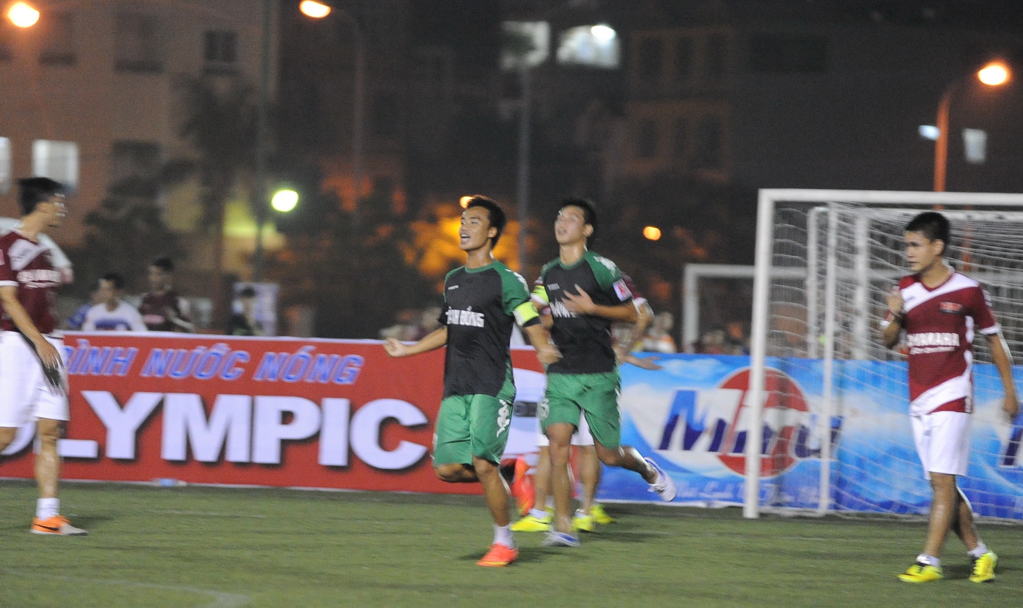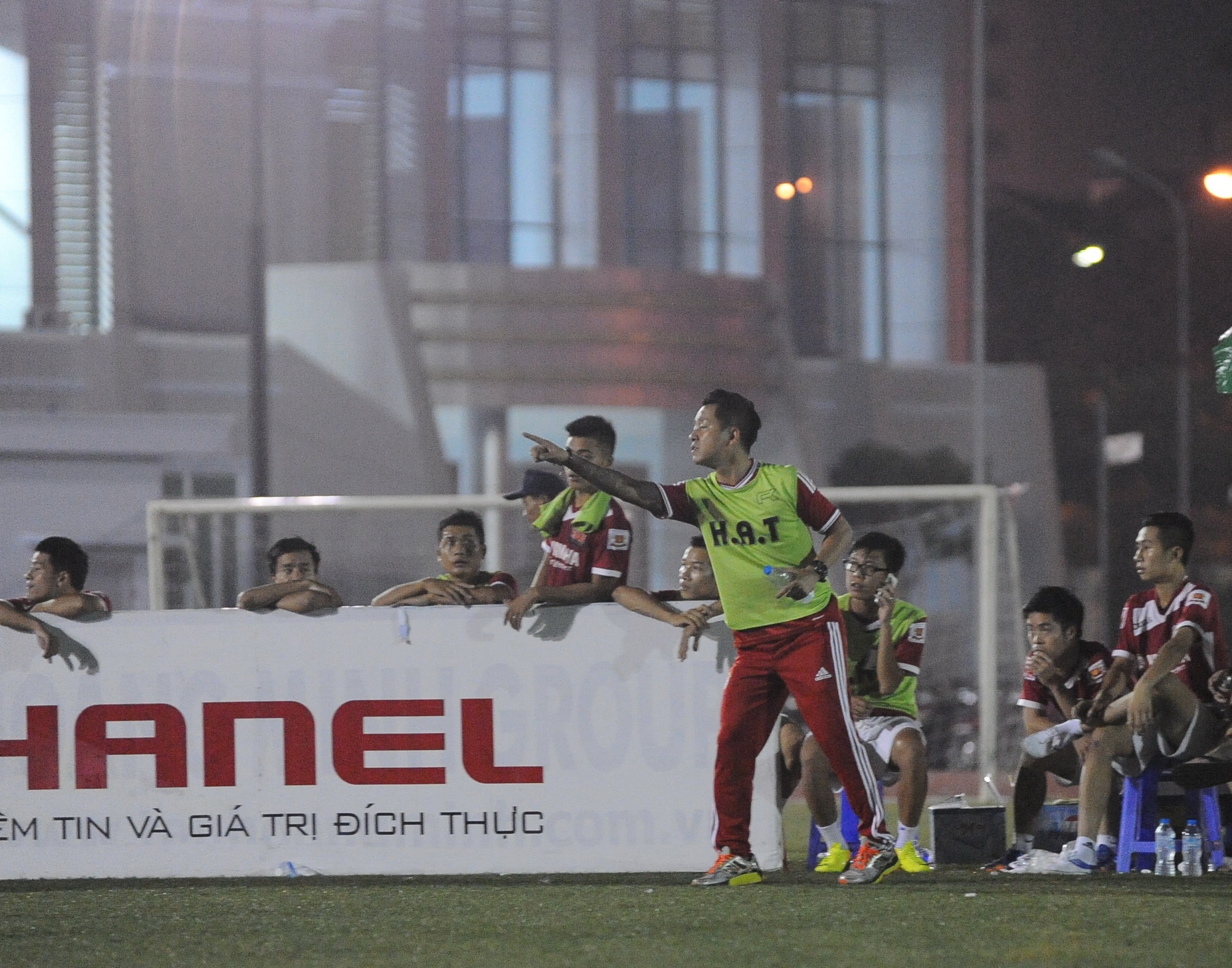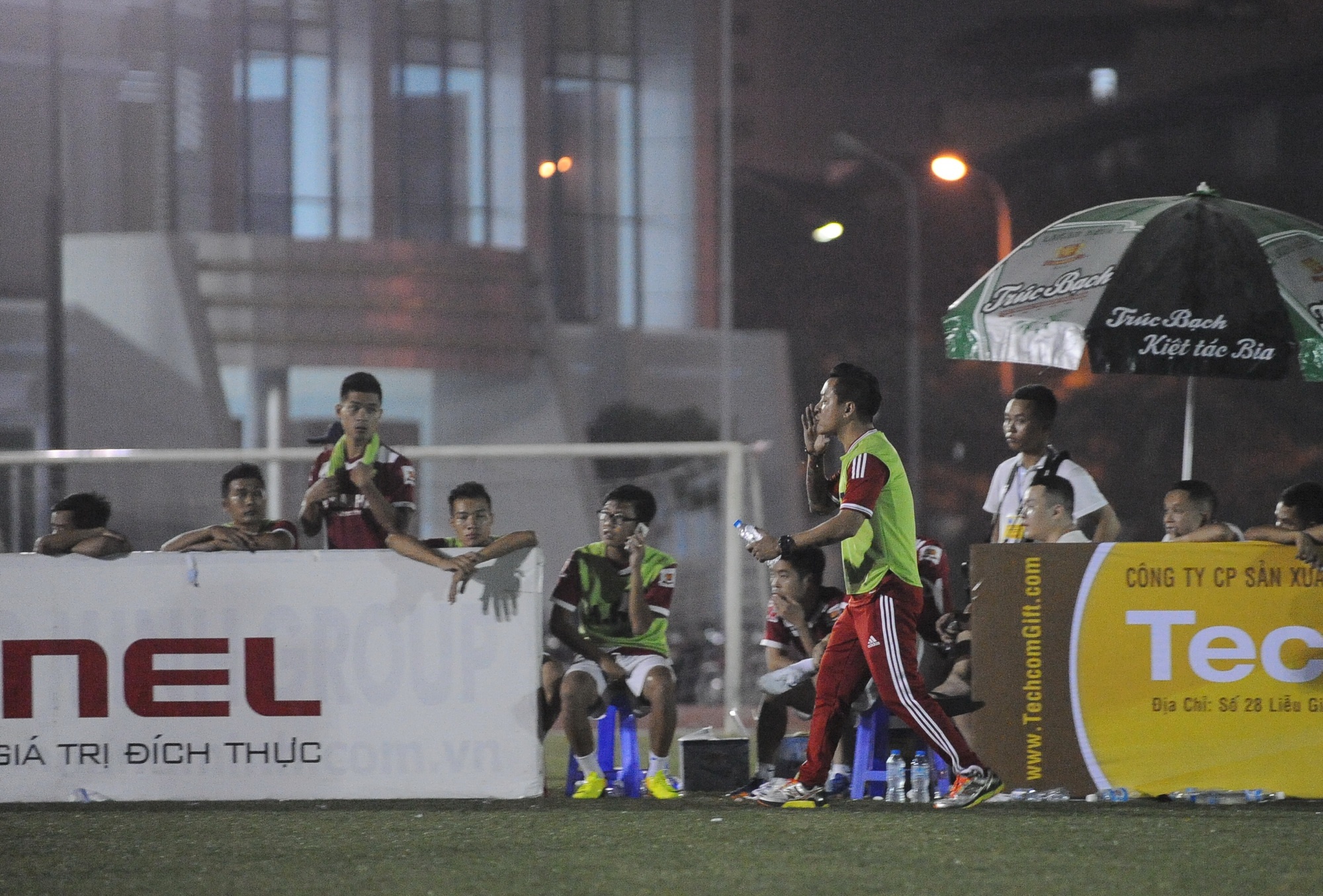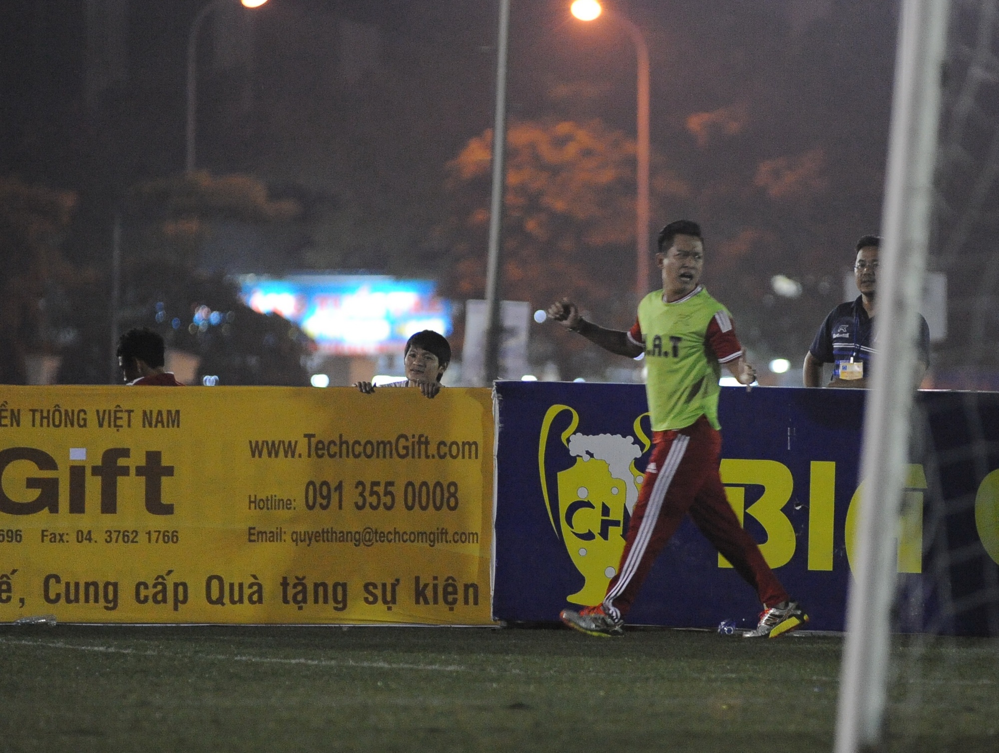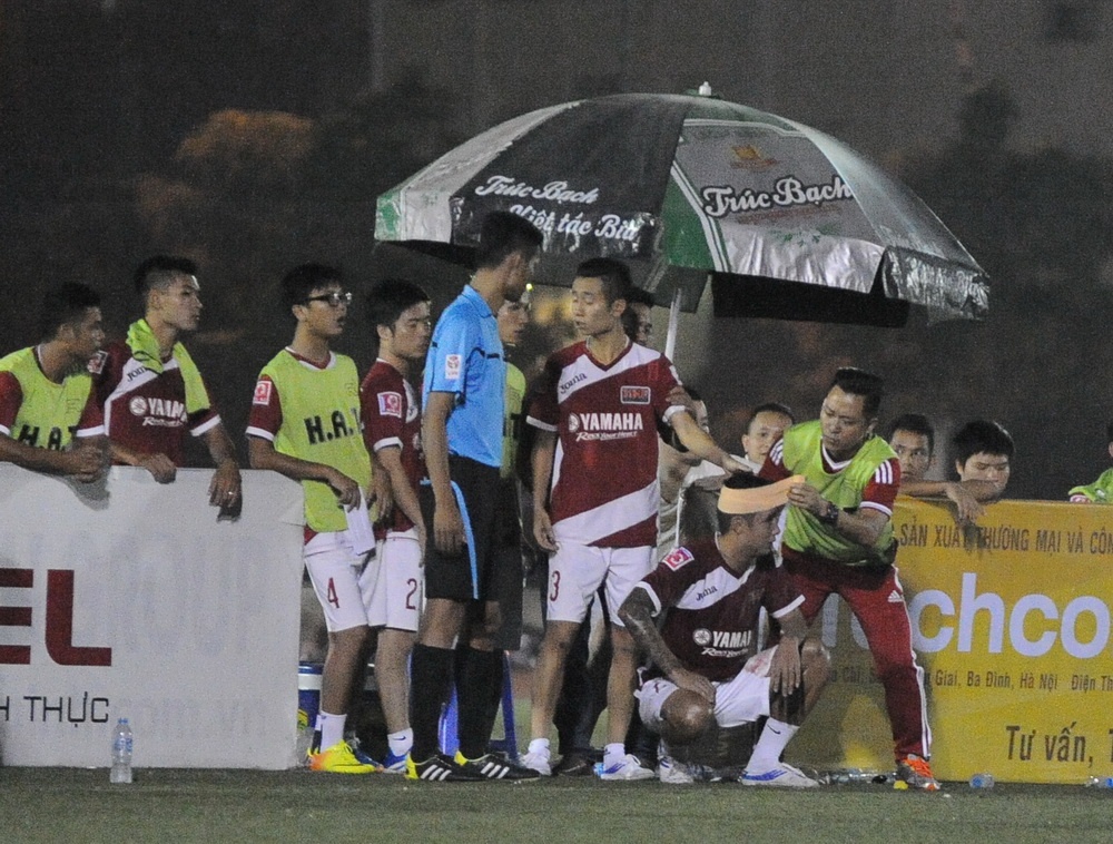 | Trận đấu trở nên kịch tính sau khi đội bóng được đánh giá mạnh hơn để lọt lưới trước. Tiền đạo Sỹ Mạnh bên phía H.A.T FC sau một pha va chạm đã phải nhờ HLV trưởng Tuấn Hưng băng đầu để tiếp tục thi đấu. |