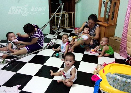 Trong căn phòng rộng chừng 10m2 nền lót gạch men màu trắng đen, tổng cộng có 8 người (3 người lớn, 5 em bé). Có bé đang bò, đứa chập chững đứng, đứa được cô dỗ dành cho ăn khiến căn phòng nhốn nháo hẳn lên.