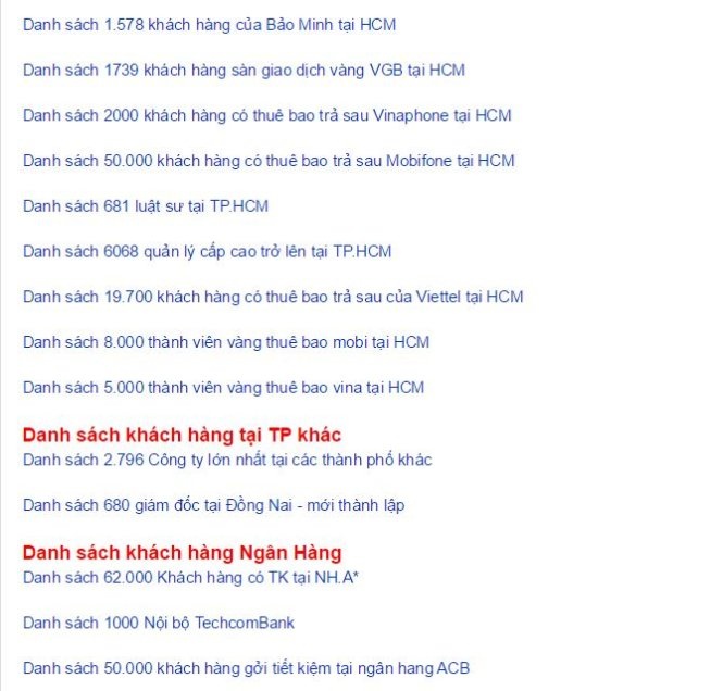 | Trích một đoạn ngắn trong danh sách của một website rao bán danh sách khách hàng. Trên ảnh, trang web này có hàng nghìn thông tin khách hàng của các đơn vị khác nhau, thậm chí là đơn vị viễn thông. |
