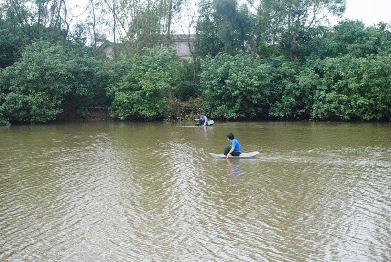 | Người nhà cùng lực lượng cứu hộ địa phương đang tích cực tìm kiếm thi thể nữ giới bị chìm dưới sông Cày. |