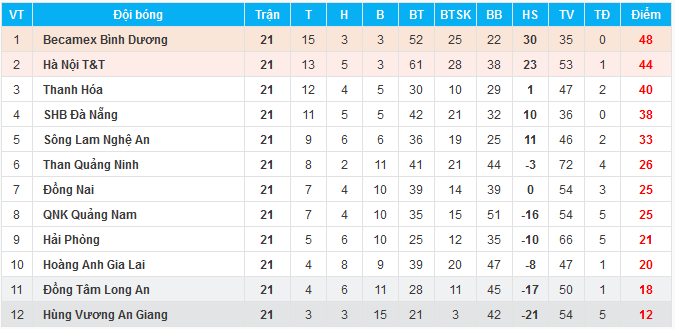 Bảng xếp hạng sau vòng 23
