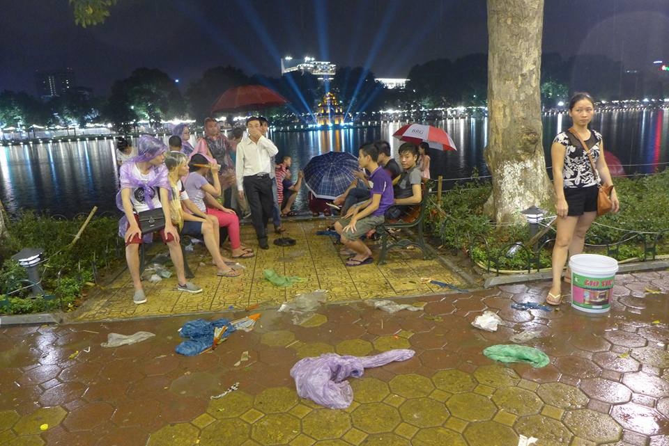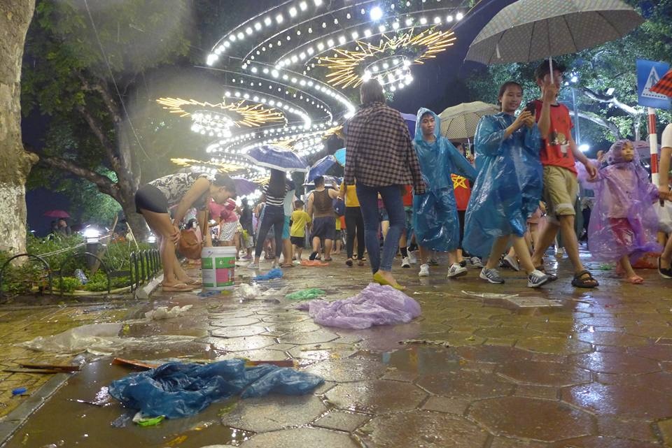 Tối 2/9, hàng nghìn người dân kéo về hồ Gươm xem bắn pháo hoa bất chấp trời mưa. Khi màn pháo kết thúc, người dân ra về, vỉa hè ven hồ vương đầy áo mưa, rác rưởi.