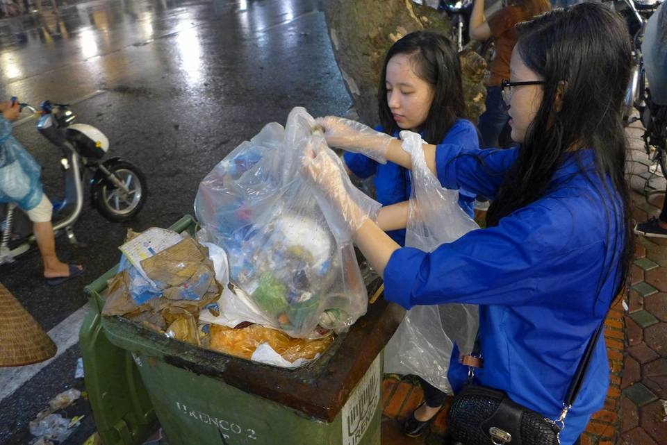 Lê Thu Trang (áo xanh), Phó bí thư đoàn phường Hàng Buồm (quận Hoàn Kiếm, Hà Nội) cho biết, sau buổi bắn pháo hoa 2/9, 200 đoàn viên, thanh niên ở 18 phường của quận cùng ra quân bảo vệ môi trường.