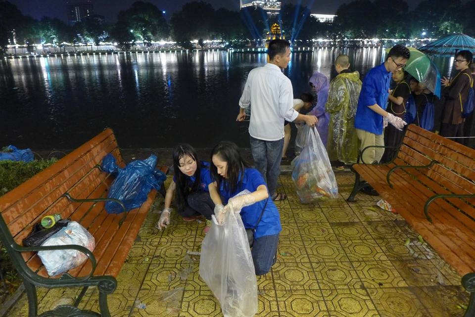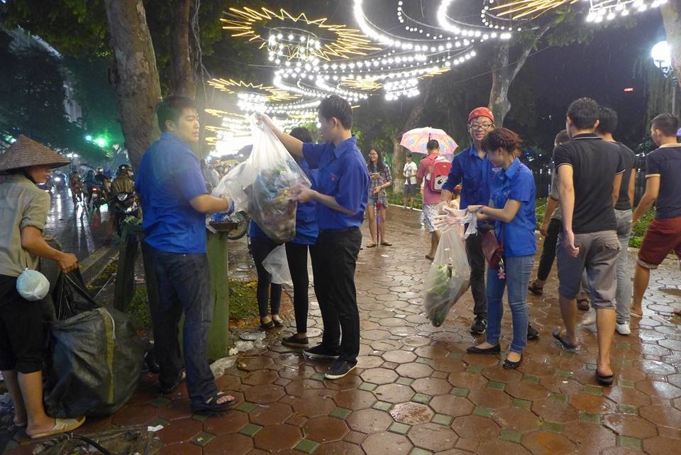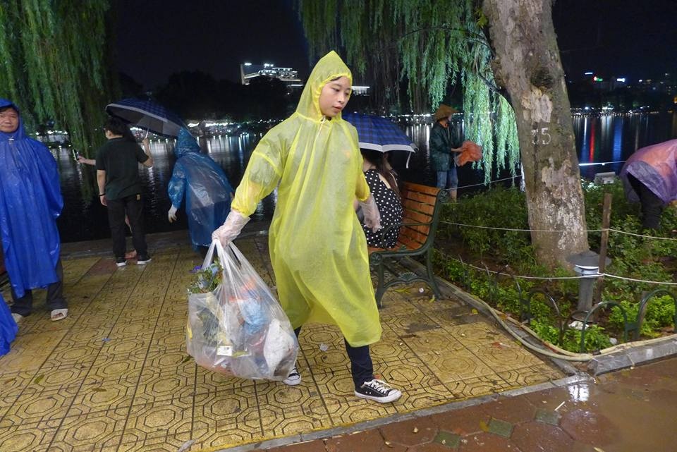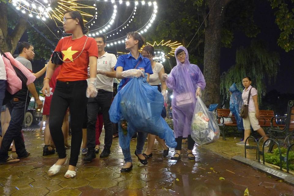 Tối 2/9, màn pháo hoa trong mưa kết thúc, vỉa hè hồ Gươm nhan nhản đủ loại rác bị người dân bỏ lại. Cả trăm bạn trẻ đã phân công nhau gom rác dọn sạch vỉa hè.