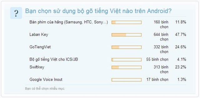 Kết quả, ứng dụng Laban Key là sản phẩm được ưa chuộng nhất với số bình chọn áp đảo gần 50%. Tiếp sau đó là hai ứng dụng GoTiengViet và Swiftkey.