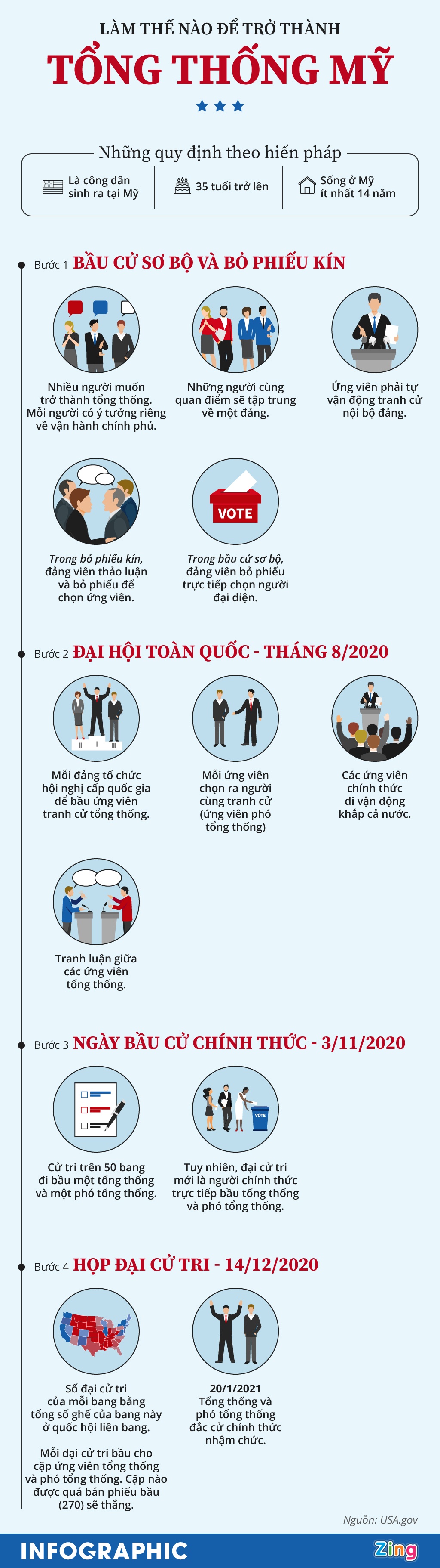 Hiến pháp Mỹ chỉ đặt 3 điều kiện tối thiểu để một người ứng cử tổng thống. Tuy nhiên, quy trình tranh cử kéo dài nhiều bước, tiêu tốn đáng kể thời gian lẫn tiền bạc của ứng viên.