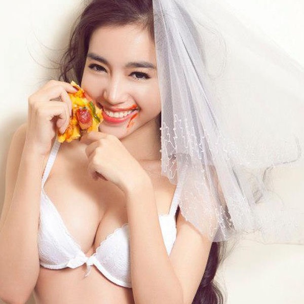| Và đôi lúc, những tạo hình gượng ép nhằm mục đích khoe ngực khủng ấy mang lại mang đến cho hotgirl những tác động tiêu cực. Như Elly Trần trong bức ảnh này, việc cô ăn pizza lem luốc không liên quan gì đến vòng một căng tròn trong y phục cô dâu thiếu vải mà Elly đang cố khoe ra. |