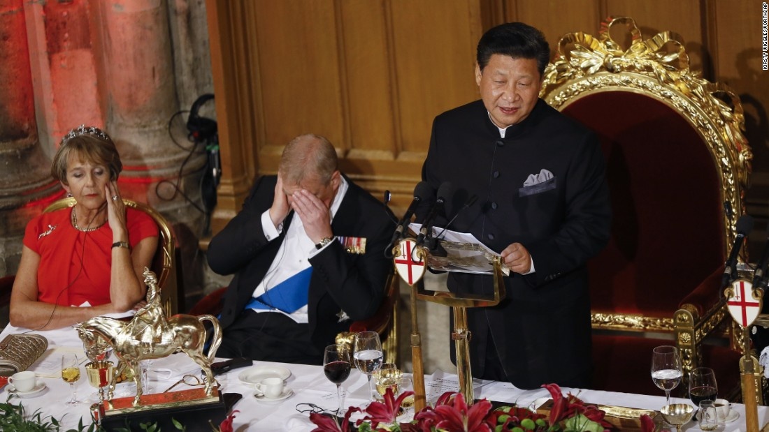 Hoàng tử Andrew của Anh gà gật khi Chủ tịch Trung Quốc Tập Cận Bình phát biểu trong một bữa tiệc ở London hôm 21/10. Sự việc nằm trong chuyến công du kéo dài 4 ngày của ông Tập tới Vương quốc Anh.