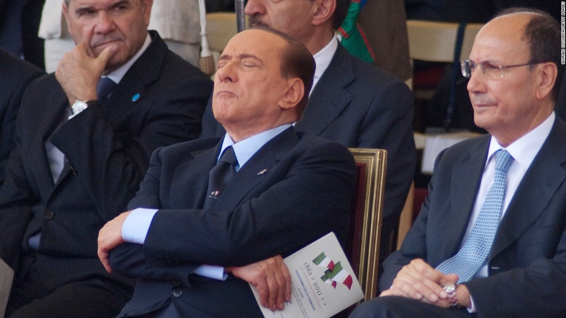 Trong cuộc duyệt binh kỷ niệm 150 năm thống nhất đất nước tại thủ đô Rome, Italy, hồi tháng 6/2011, cựu thủ tướng Italy, ông Silvio Berlusconi, tranh thủ chợp mắt vì quá mệt.