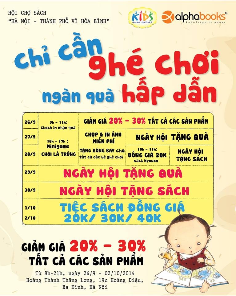 Ngày 27 và 29/9: Ngày hội tặng quà của Alpha Books, bạn đọc sẽ được tặng những phần quà dành cho hóa đơn mua sách Alpha Kids trên 150.000 đồng.