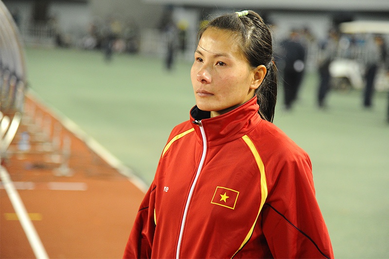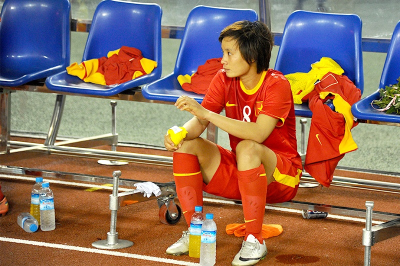 | Minh Nguyệt ngồi chết lặng ngoài sân sau khi trận đấu kết thúc. Chị là người mở tỷ số trận chung kết và có tổng cộng 5 bàn thắng tại SEA Games 27. |