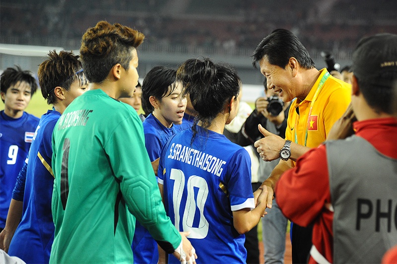 | Kết thúc trận đấu, HLV người Trung Quốc Trần Vân Phát ra chúc mừng đối thủ Thái Lan. |