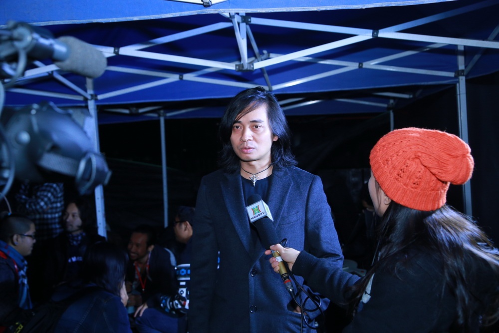 | Guitarist Tuấn Hùng trả lời phỏng vấn. Anh chia sẻ trong buổi họp báo Đôi bàn tay thắp lửa rằng không muốn làm người phát ngôn cho nhóm Bức Tường thêm một lần nào nữa và mong Trần Lập sớm trở lại với vị trí này. |