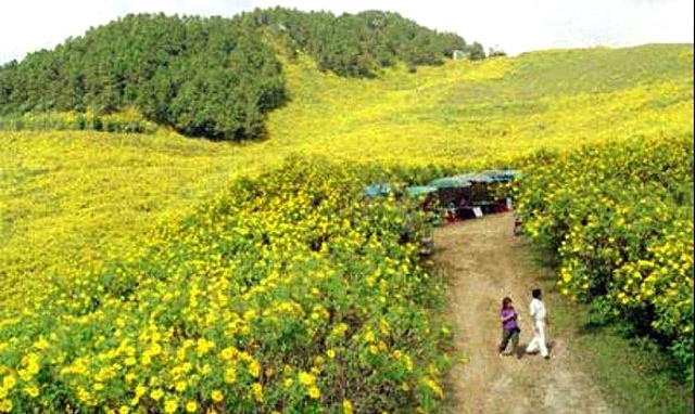 Điện Biên tuy không nổi tiếng với mùa hoa dã quỳ, nhưng nếu có cơ hội đến đây vào tháng 11, bạn hãy đi dọc tuyến đường Mường Phăng để chiêm ngưỡng và ghi lại hình ảnh những con đường vàng rực hoa dã quỳ.