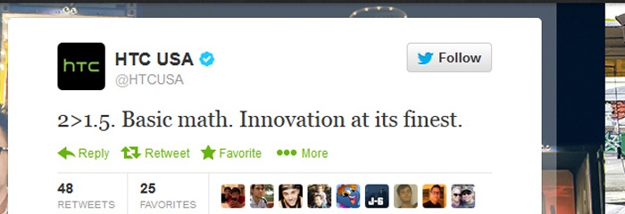 Apple tự hào khoe kích thước các điểm ảnh trên iPhone 5S rất lớn, ở mức 1,5 micromet. Tuy nhiên, kích thước điểm ảnh của HTC One lên đến 2 micromet. Đưa ra phép so sánh "2 > 1,5", HTC đồng thời gửi đến Apple một thông điệp: "Đã sáng tạo thì phải làm cho triệt để".
