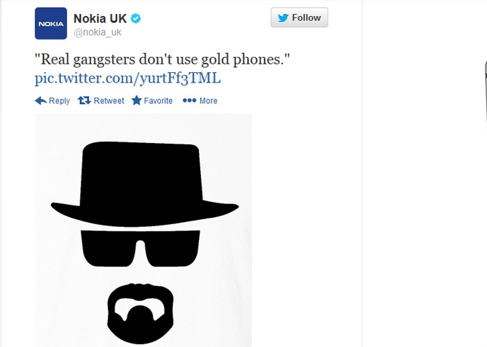 Nokia UK (Anh) sau khi châm chọc Apple là kẻ bắt chước, lại tiếp tục đá xoáy đối thủ bằng một câu khá hài hước: "Gangster đích thực không xài điện thoại màu vàng". Trong khi đó, Apple vừa mới ra mắt iPhone 5S với màu vàng champagne, bên cạnh màu trắng sapphire và màu xám truyền thống.