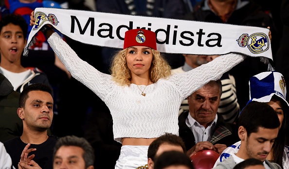 | Một fan nữ của Real tiếp lửa cho Ronaldo và đồng đội từ khán đài sân Stade de Marrakech. |