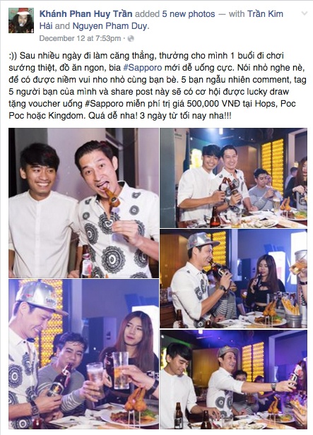 Rất hài lòng với vẻ ngoài mới mẻ cùng hương vị đặc biệt phù hợp với gu của người Việt sành bia, nam diễn viên điển trai Huy Khánh đã bị Sapporo chinh phục ngay từ bữa tiệc sinh nhật sớm của mình. Huy Khánh khá bất ngờ nói: “Khánh uống nhiều loại bia lắm rồi và đây không phải là lần đầu uống Sapporo, nhưng mà đúng là lần đầu uống… Sapporo mới. Chỉ có thể nói một từ ghiền mà thôi”. |