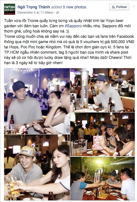 Ca sĩ Tronie Ngô lựa chọn Sapporo để bữa tiệc cùng bạn bè thêm sôi động và cuồng nhiệt hơn. Giải thích cho việc lựa chọn này, Tronie Ngô tự nhiên chia sẻ: “Tronie là người thích trải nghiệm những thứ mới mẻ. Thế nên vừa biết Sapporo đang tung ra dòng sản phẩm mới, Tronie đã thử liền. Thử xong, chắc Tronie… uống hoài Sapporo loại mới này luôn quá! Tại Sapporo mới đỉnh quá đỉnh!”. |
