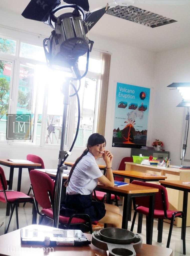 | Trang đang ngồi chờ ekip sắp xếp ánh sáng, máy quay. |