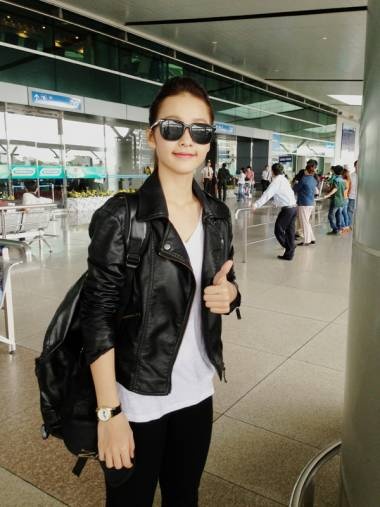| Trong những chuyến bay ngắn, Khả Ngân luôn chọn trang phục tươi trẻ, thoải mái. Ảnh: Sao online. |