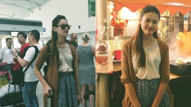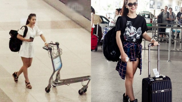 | Hà Lade diện trang phục nữ tính ở sân bay trong chuyến du lịch sang Singapore cùng bạn trai. Ảnh: Sao online. |