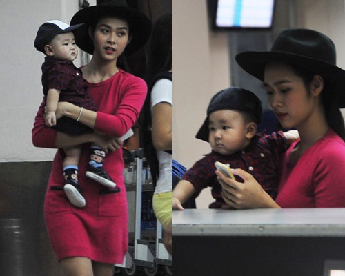 | Hot girl làm mẹ Diệp Bảo Ngọc cùng con trai đầu lòng ăn mặc sành điệu tại sân bay. |