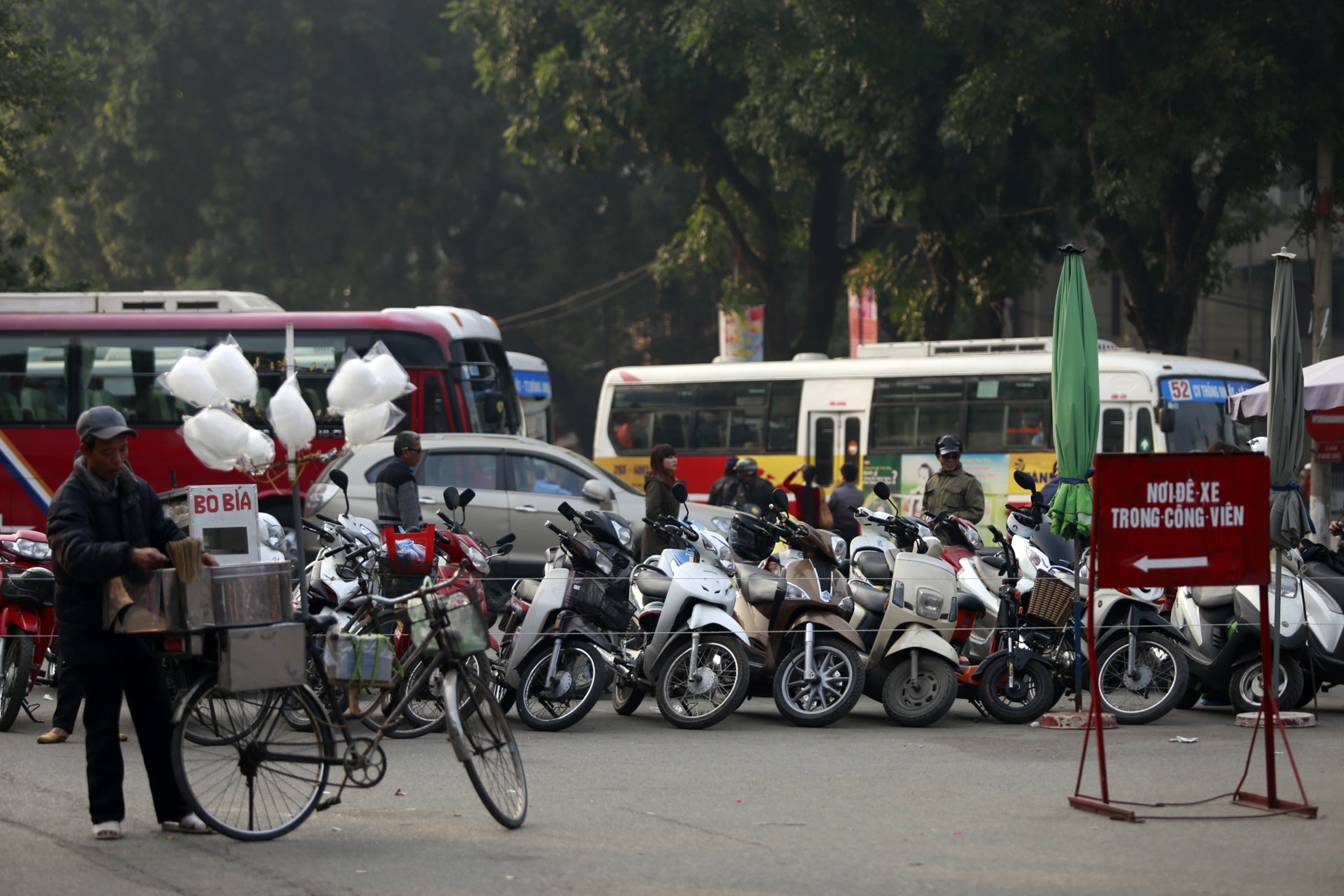 | Trước cổng công viên Thống Nhất, khu vực giữ xe máy tràn ra lòng đường do lượng khách quá đông. |