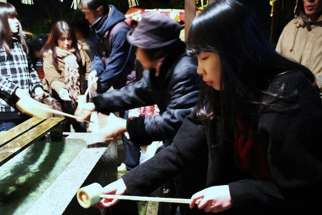 | Trong ảnh là du học sinh Việt tham gia lễ đền mang tên là Asami (Nhật). Trước khi vào đền, mọi người đều phải rửa tay và uống nước để cầu cho năm mới gặp nhiều may mắn. |
