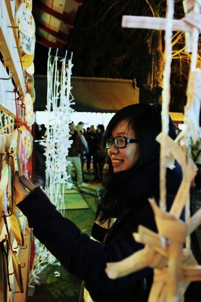 | Hà Trang (du học sinh Nhật) tham gia lễ Asami và đang treo điều ước được viết trên gỗ của mình. |