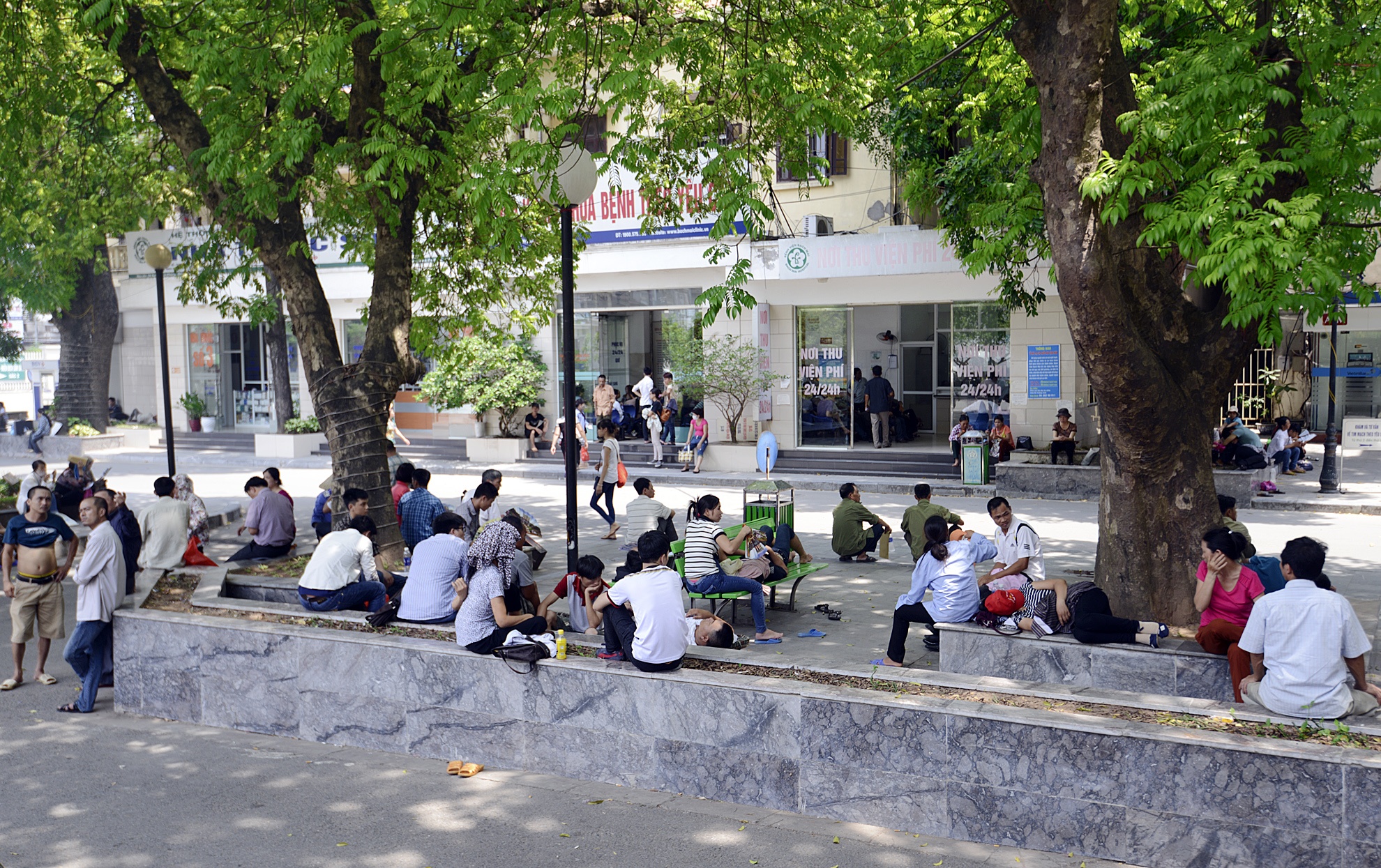 | Trưa ngày 27/5, trong khuôn viên bệnh viện Bạch Mai (Hà Nội) rất đông người nhà bệnh nhân vạ vật dưới bóng cây, bên ghế đá nằm nghỉ. Thời tiết nắng nóng lên tới 39 độ C khiến ai cũng mệt mỏi và khó chịu. |