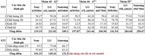 Theo đó, có một điểm chung ở cả ba hạng mục là phần thắng đều thuộc về sản phẩm của LG. Samsung về nhì ở hai phân khúc 46 - 47 inch và 55 inch, trong khi Sony được xếp thứ hai ở nhóm 40 - 42 inch, với kết quả chỉ thua kém chút ít so với sản phẩm của LG.