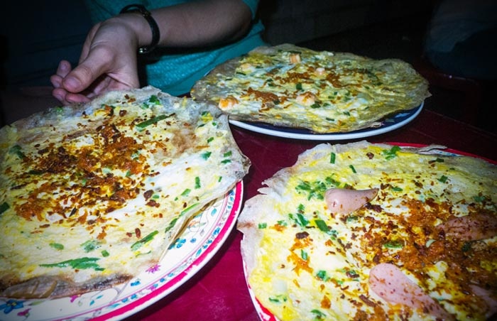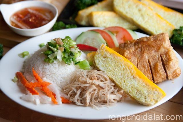 Buổi tối, món bánh tráng không khó tìm. Bạn sẽ gặp các gánh hàng rong vòng quanh hồ Xuân Hương, hoặc trong khu chợ đêm Đà Lạt. Thành phần chính tạo nên món ăn là bánh tráng và trứng gà, được điểm xuyết thêm ít hành lá và tép khô. Khi ăn, chỉ cần cho lên một ít tương ớt, gấp tròn lại là thực khách đã có thể thưởng thức món ăn gây thương nhớ cho bao người. |