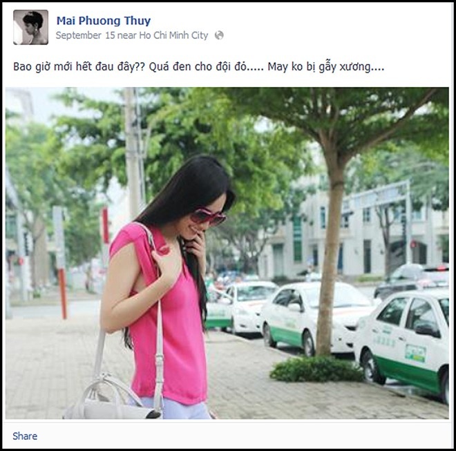 Hai tháng trước vụ Mai Phương Thúy bị giật túi, quán quân The Voice mùa đầu tiên than thở trên trang cá nhân về chuyện mất điện thoại khi đang dạo phố. Cô chia sẻ hình ảnh chụp cùng chiếc điện thoại cũ và viết: "Nguyên văn đây là hình ảnh cuối cùng của cái điện thoại thân yêu của em".