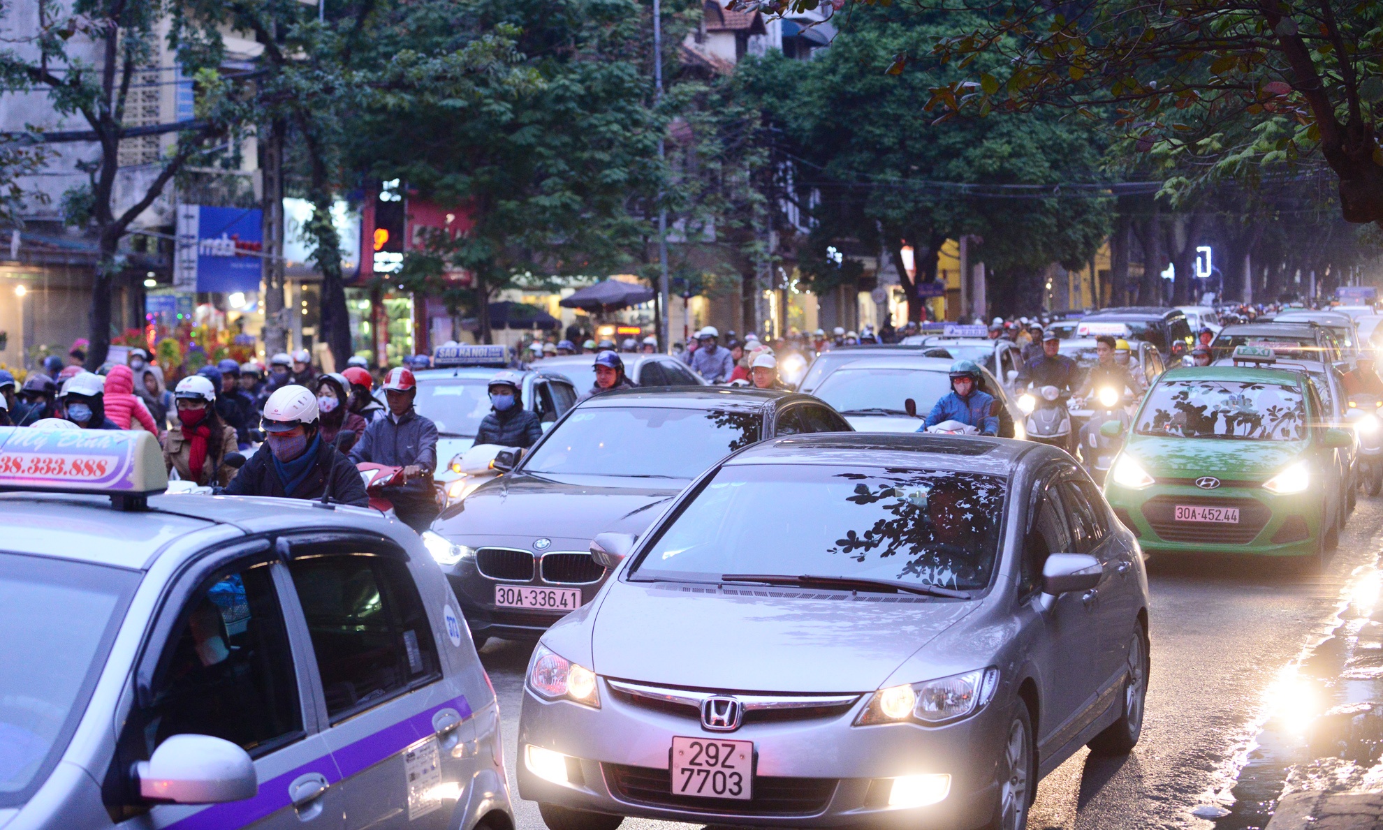 Trên phố Bà Triệu từng dòng xe ô tô nối nhau di chuyển chậm.