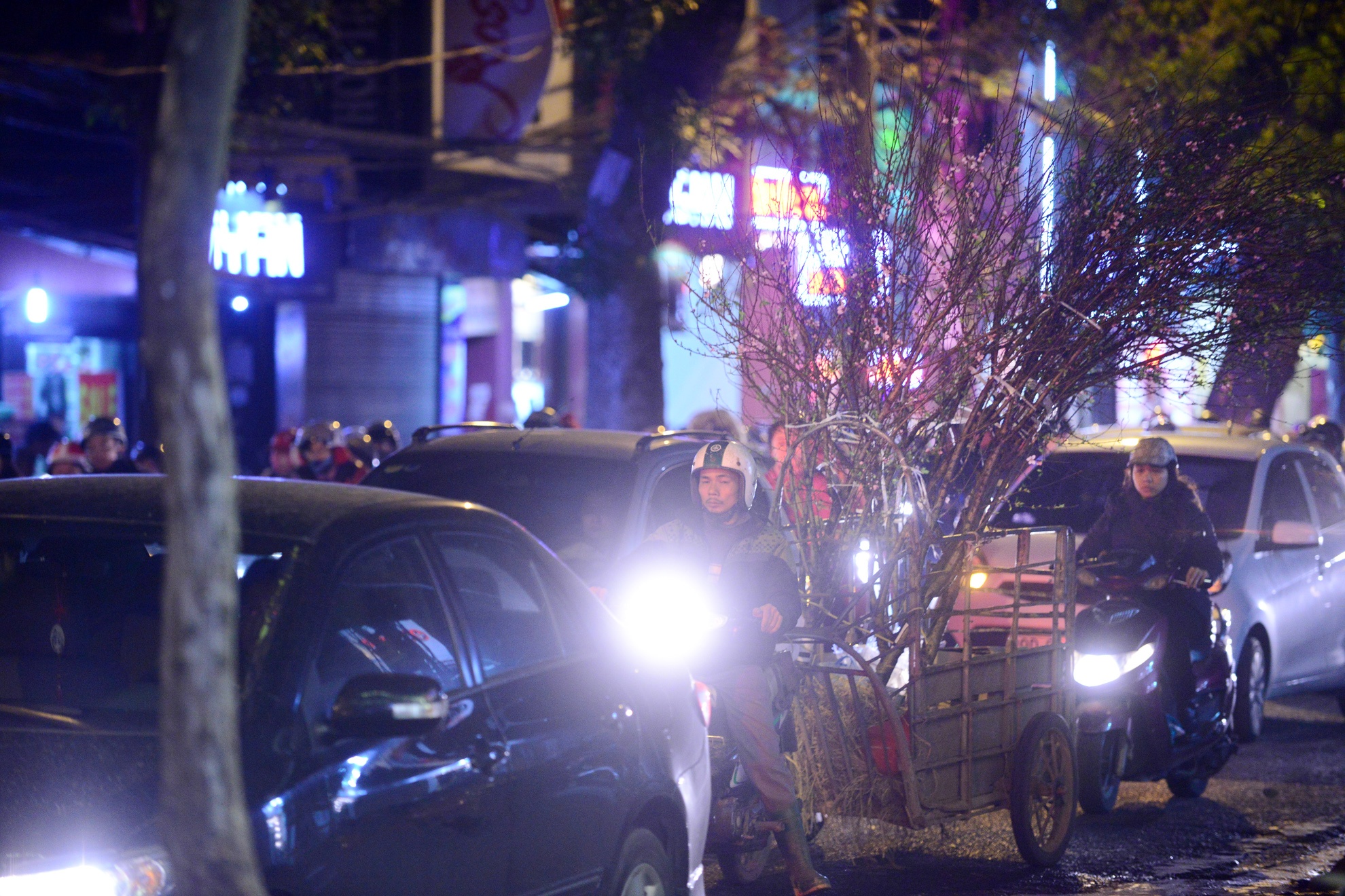 Người chở đào vất vả chen lấn giữa những ngày áp Tết.
