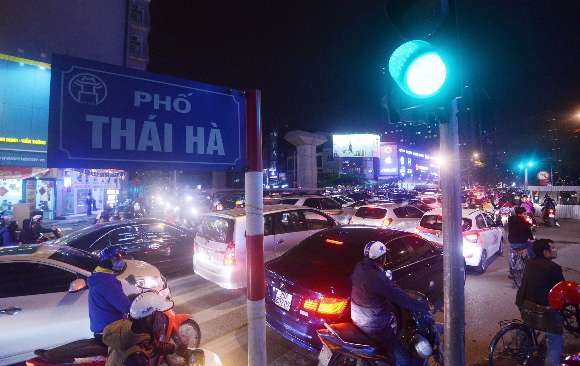 | Vào giờ tan tầm, người đi đường phải chờ tới 4 nhịp đèn đỏ mới thoát qua đoạn giao với Hoàng Cầu, phố Thái Hà Mới. |
