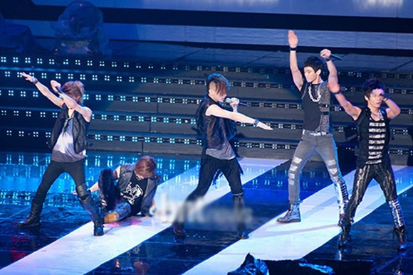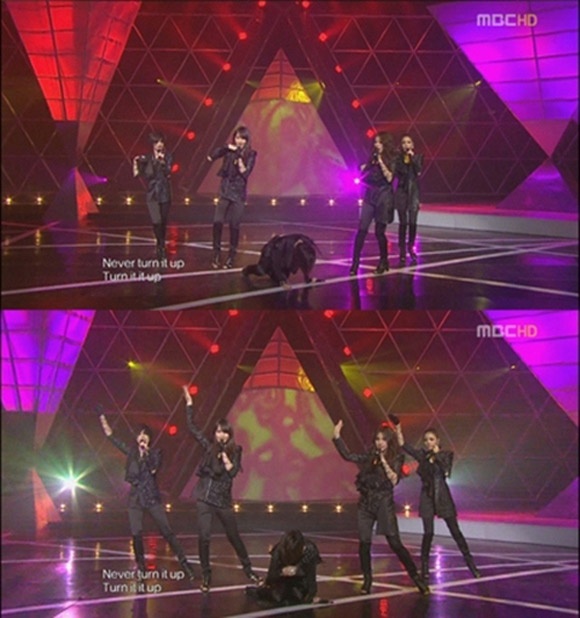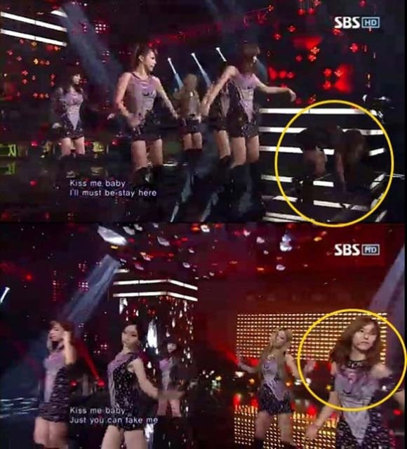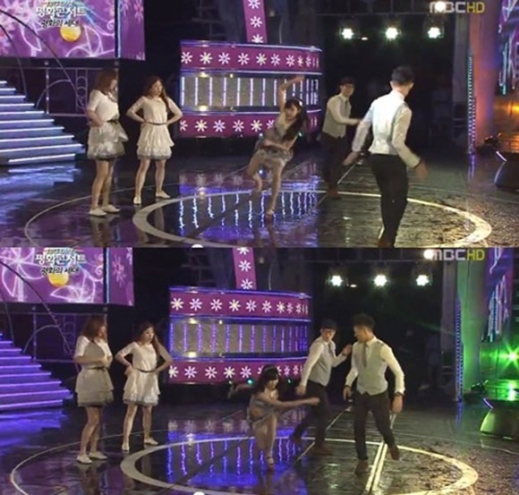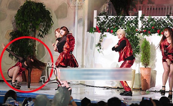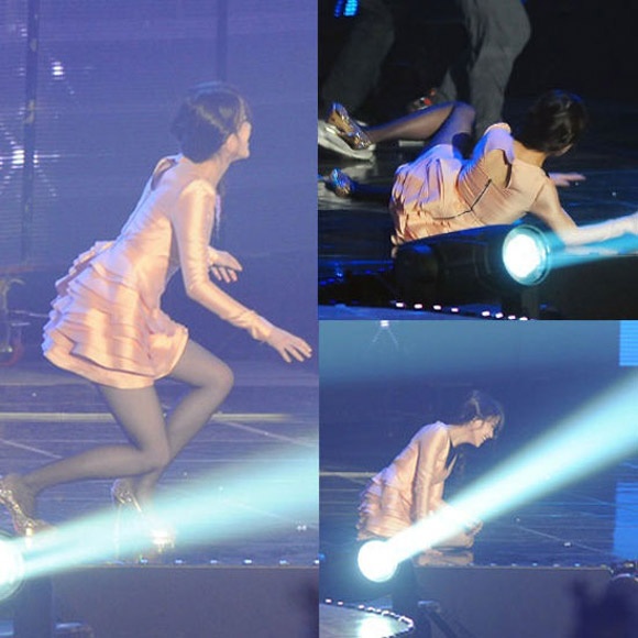 | Lee Haeri nhóm Davichi bị trượt chân và ngã gục trên sân khấu Star Night Jam Concert – Reborn 2011. |