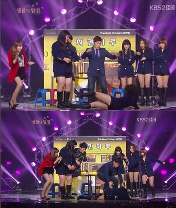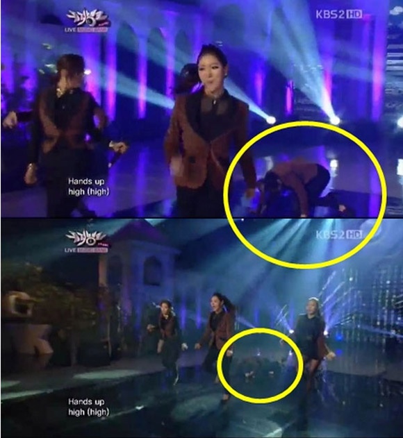 | Seo Ah nhóm Brave Girls ngã trong màn biểu diễn tại Music Bank. |