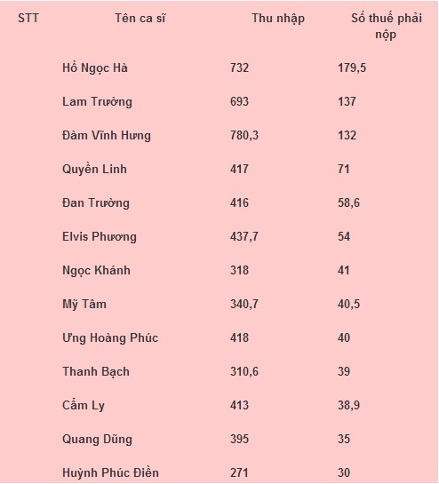 Đầu tháng 1/2014, 5 ca sĩ ngôi sao hàng đầu Vbiz tiếp tục được cơ quan thuế mời lên làm việc để "đòi nợ" số tiền thuế nộp bổ sung trong giai đoạn năm 2010 - 2012 lên đến con số hơn 1,3 tỷ đồng. Việc kê khai thu nhập của năm 2013 cũng đang được các sao Việt thu thập và tổng kết để nộp cho cơ quan thuế.