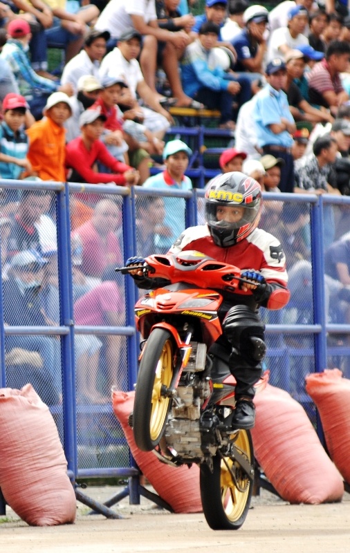 | Một tay đua hào hứng "bốc đầu" biểu diễn trên đường về đích. |