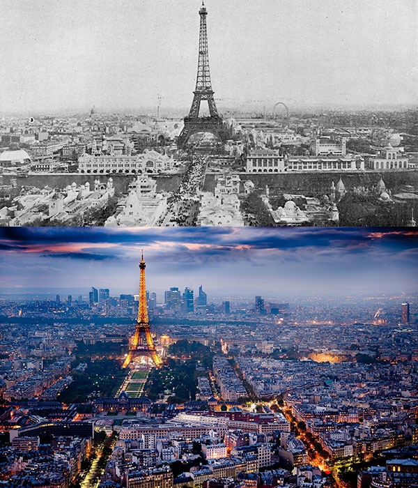 | Tháp Eiffel vẫn là biểu tượng của kinh đô ánh sáng Paris (ảnh chụp hồi đầu thế kỷ 20 so với hiện tại). |